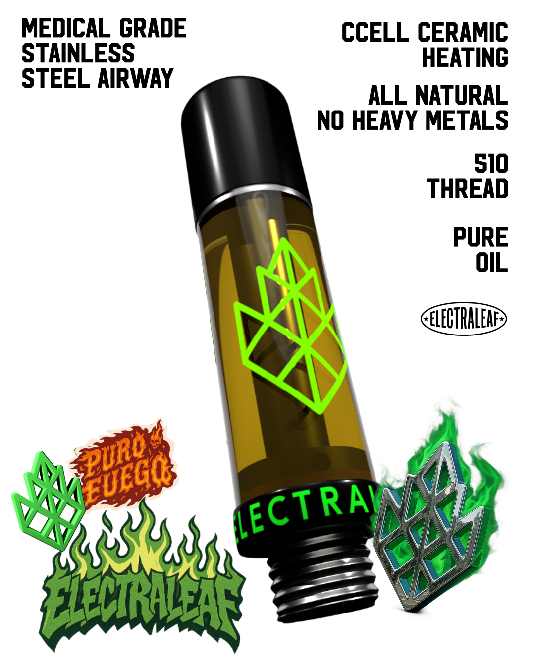 We didn’t just make a vape cart  we made the cart we wanted to smoke. Electraleaf combines premium cannabis oil with hardware engineered to maximize performance, purity, and flavor. Every detail  from the stainless steel airway to the ceramic CCELL heating system  is designed to protect the integrity of our oil and deliver clouds that hit harder, taste better, and stay consistent from start to finish. Built tough, clean, and culture-driven, this is vaping done the Electraleaf way.